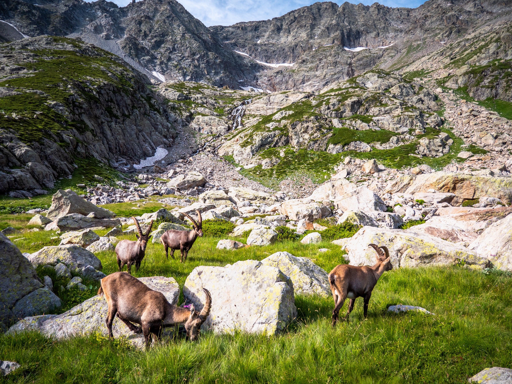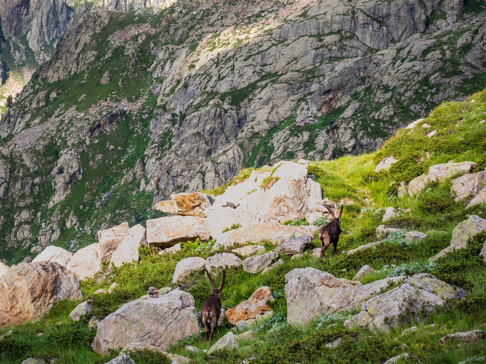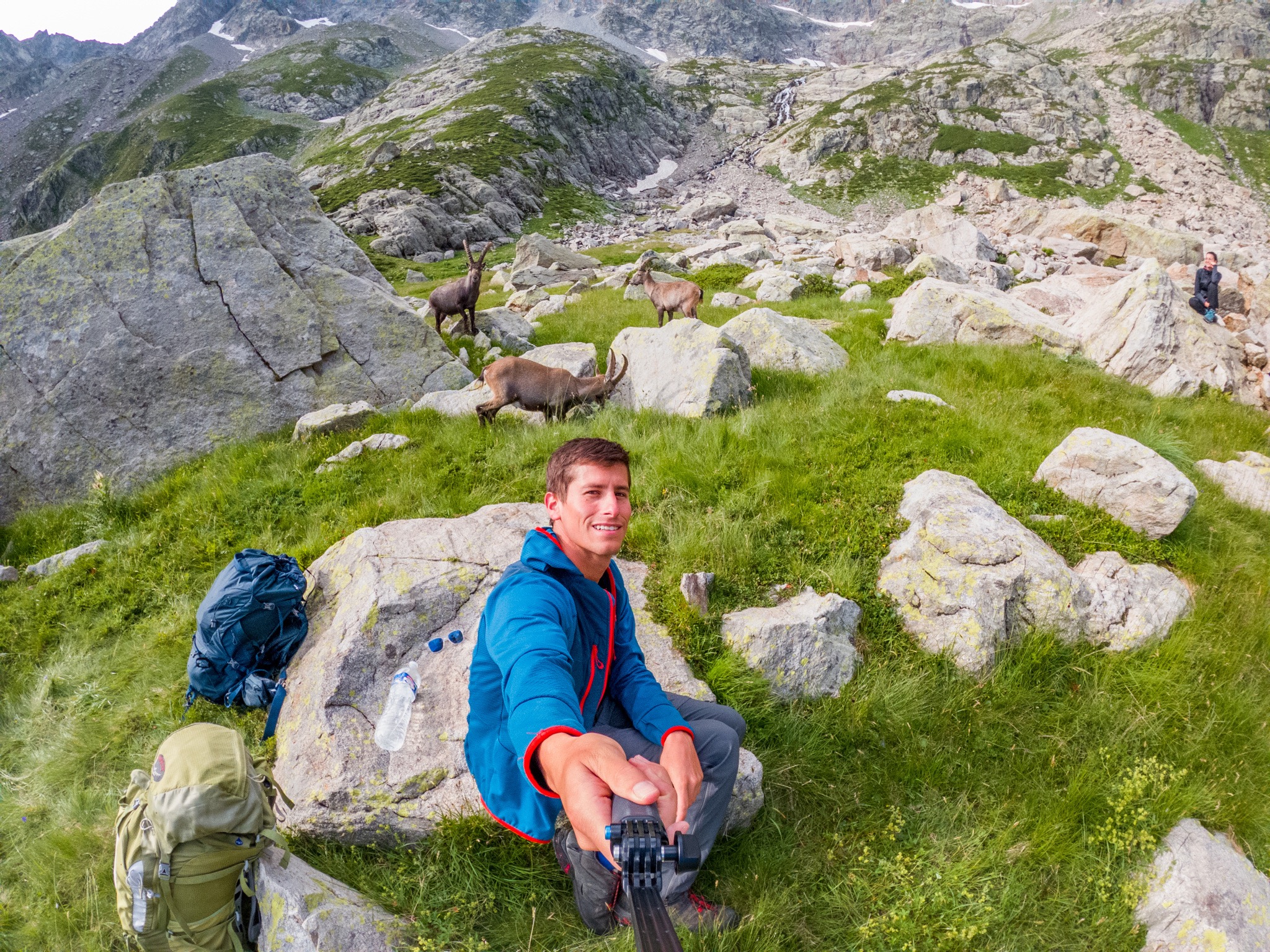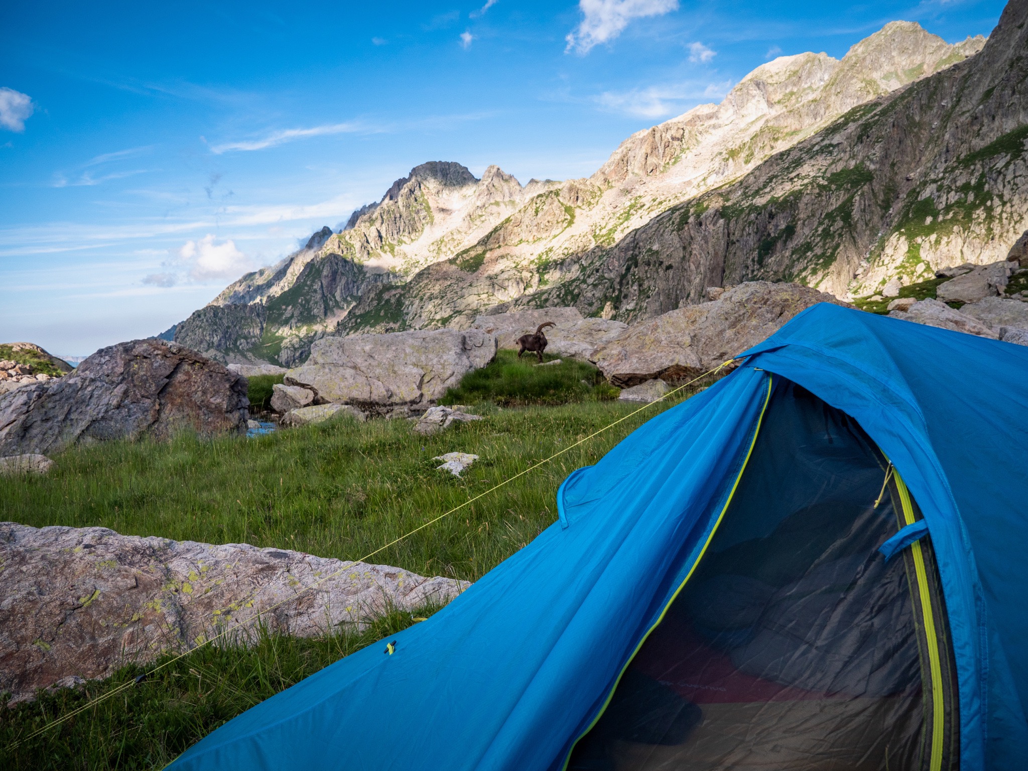 Après avoir installé notre tente pour la nuit, une famille de bouquetins est venu nous rendre visite. Au réveil cette famille de bouquetins est venue juste à côté de notre lieu de bivouac et nous avons pu ainsi les observer dans des conditions exceptionnelles.