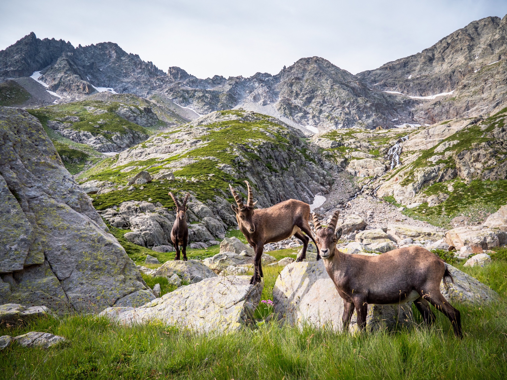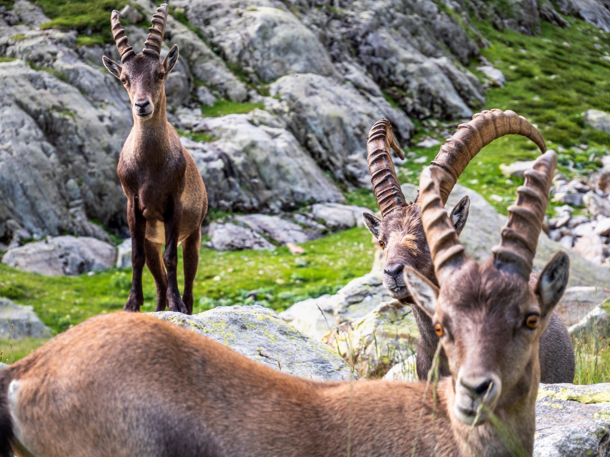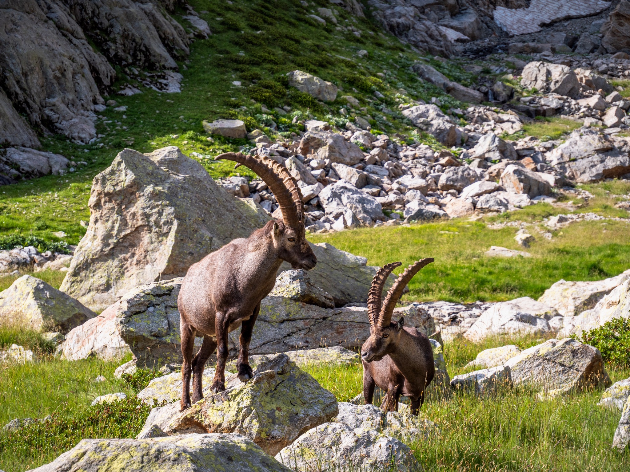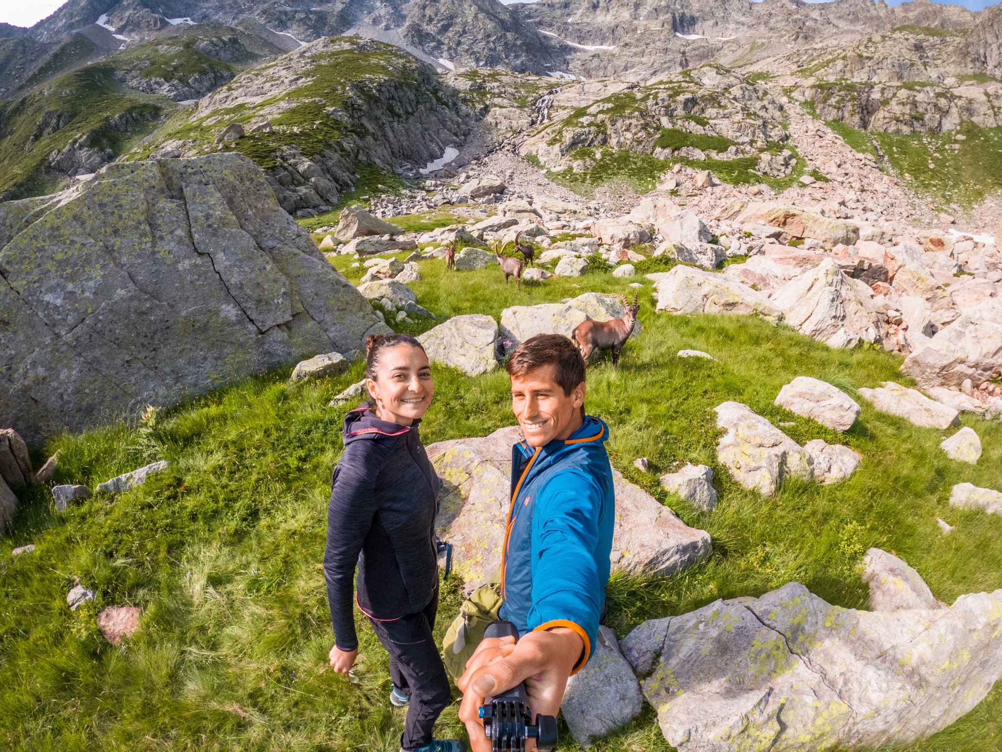 Après avoir installé notre tente pour la nuit, une famille de bouquetins est venu nous rendre visite. Au réveil cette famille de bouquetins est venue juste à côté de notre lieu de bivouac et nous avons pu ainsi les observer dans des conditions exceptionnelles.